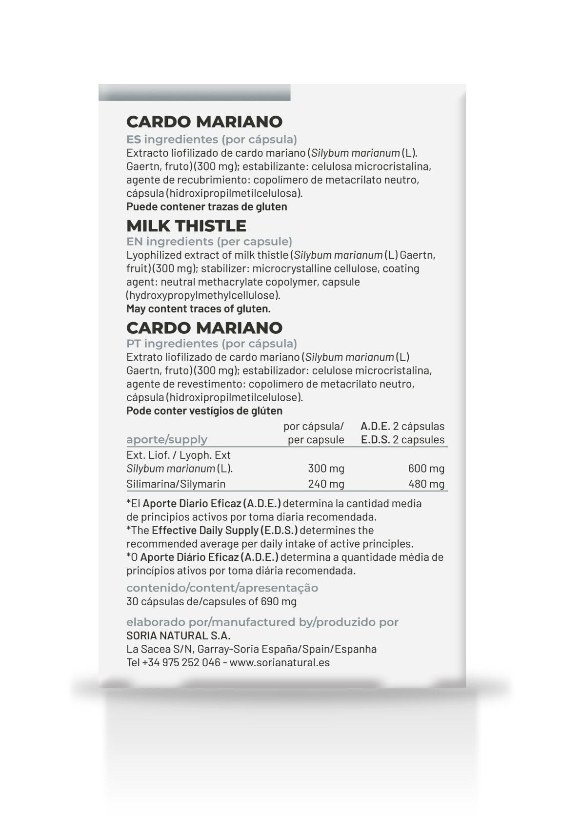 (por cápsula) Extracto liofilizado de cardo mariano (Silybum marianum (L.) Gaertner ) (fruto) (300 mg); estabilizante: celulosa microcristalina, agente de recubrimiento: copolímero de metacrilato neutro, cápsula (hidroxipropilmetilcelulosa). Puede contener trazas de gluten.
